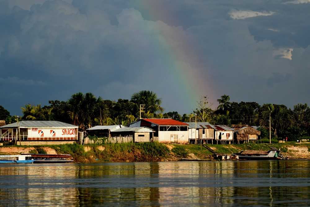 In our way back to our ship the lake was very calmed as a mirror, the wind ceased, and the orange sun was coming down on the horizon, while in the opposite direction of the sphere the drizzle was falling on the town, drawing in the background a beautiful rainbow. What a spectacular breathtaking scenario to end a wonderful day at the Upper Amazon.
