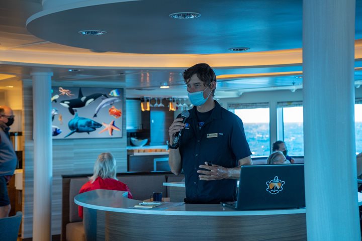 The wildlife predictions of the morning turned out to be extremely accurate, as a humpback whale quickly interrupted a snorkel briefing by continuously breaching and tail throwing in close proximity to the ship. All afternoon long, whales leapt out of the water as the ship transited between Gorda Banks and La Fortuna – the aforementioned mating and birthing grounds of these animals – moving farther into the Gulf of California for the continuation of our journey Among the Great Whales.