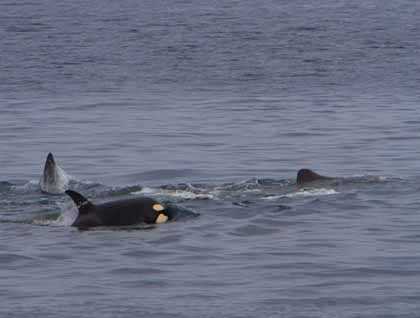 As we left San Pedro Martir behind, we headed into the flat-calm waters of the Gulf. After some time spent looking and looking for marine creatures, we were surprised by our finding. At least two orca in the distance that splashed around, apparently very near some other bigger whales. The closer we got, the more adrenaline flowed on the bow as we watched in awe, a group of sperm whales forming a rosette, tails facing outward and heads together, as they seemed to protect their young from the killer whales’ attack. Out of nowhere, a massive male sperm whale rushed into the scenario, violently splashing with its huge flukes. The orca did not stay for very long after the male leviathan showed up. After all the commotion, we could see a very new sperm whale calf, which was apparently safe and intact after the orca’s attempt to attack.