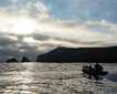 After lunch, several guests used kayaks and paddle boards to explore the shoreline. A special experience for those on Zodiac cruises was to get up close to a pod of Risso’s dolphins and watch their lively acrobatics as they pursued a school of bait fish. Interspersed with the dolphins were many sea lions, and of course, the ever-watchful gulls looking for scraps. The day was a photographer’s dream with rays of sun streaming through misty canyons, lending a magical veneer to a magical day.