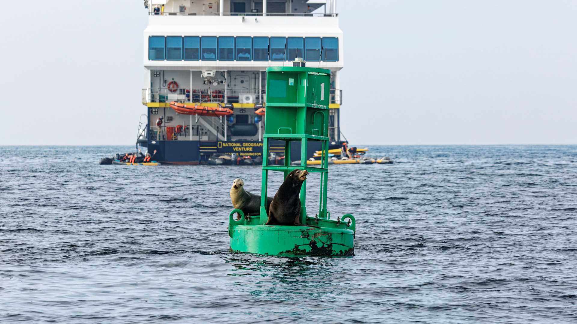 We arrived at Two Harbors in misty and grey conditions, which soon developed into a calm and sunny day. Morning activities included leisurely hikes to observe wildlife and stunning vistas. Zodiac cruises were highlighted by “gangs” of young lions burning off excess energy and one large male that held court from his “throne” on a navigation buoy. Cormorants and a few pelicans were densely packed on the appropriately named Bird Rock.