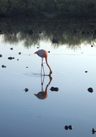 We were already anchored at Cerro Dragon, north of Santa Cruz Island, when morning broke. The skies were clear, the waters calm and the moon was still up in the sky as we approached the landing spot for our pre-breakfast visit. We began our walk and just a short while afterwards we found a small lagoon of brackish waters.  It was surrounded by a landscape of incense trees and prickly pears, and soon we discovered that three greater flamingos were there, filtering the muddy waters with their beaks. In the morning light this was a sublime scene. We then moved further inland; Cerro Dragon is famous for being the home to a small population of the endangered land iguanas. The morning sunshine had already started to warm up the ground, so many iguanas had already emerged from their nocturnal hideout places and were basking in the sun. From the top of the hill we could see both the highlands of Santa Cruz other islands in the vicinity.