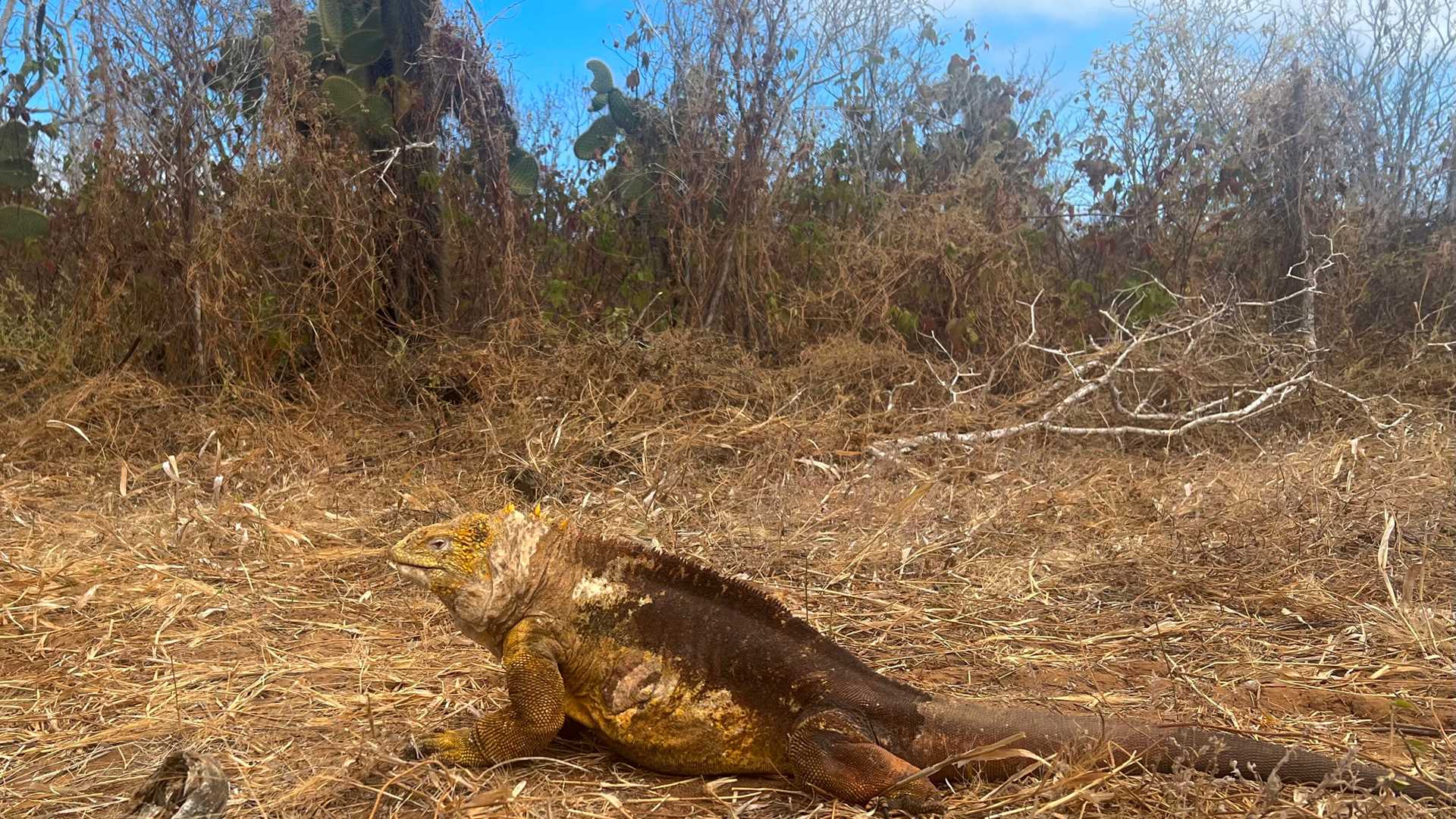 Today we explored the western part of Santa Cruz Island to find dragons. Galapagos is known for its endemic reptiles, and the last one we needed to find for our species checklist was the Galapagos land iguana, a yellow reptile with an intimidating gaze that lives in burrows and basks in the sun on many of the islands. A good place to find them is the western part of Santa Cruz at a site called Dragon Hill. This is a restored area of the national park. In Santa Cruz, we have a large human population. The area used to have a lot of introduced species, but they were locally eradicated. Iguanas bred in the research station were returned to the wild. During our hike in this dry forest, we encountered quite a few. We observed some iguanas engaged in mating behavior, which consists of a slow chase by the males with the females walking away from them. Land iguanas are a sister species of marine iguanas, but they have very different habitats and behavior. It was interesting to see their burrows and habitats. As the day warmed up, it was time to go to the water. For the rest of the morning, we snorkeled. Our hotel department offered an Ecuadorian lunch, so we got to taste many of the dishes that are part of the diverse Ecuadorian cuisine.