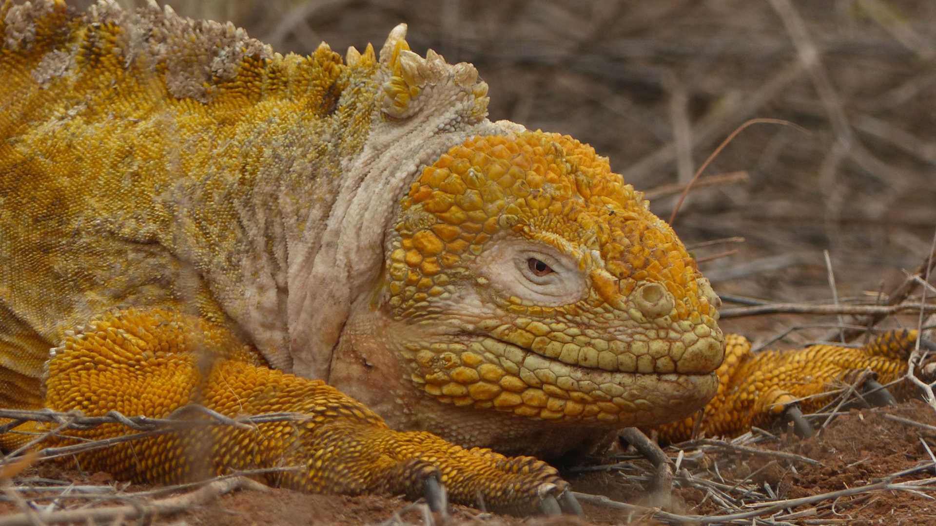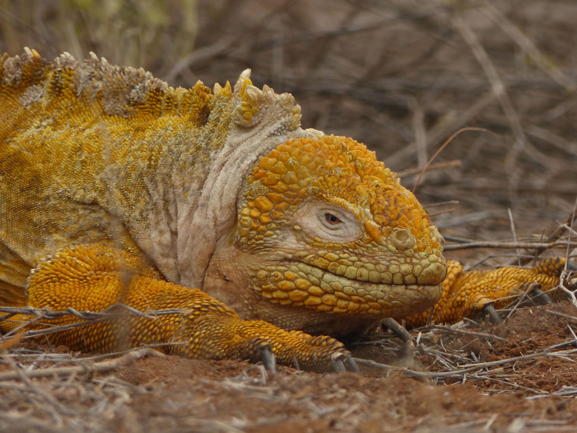 The Galapagos land iguanas also have adapted to long periods without rain. That is what has made them excellent colonizers; patient acceptance of the conditions in the face of scarcity. Not that they can really do much to change the situation, unlike we humans who continually change our environments. Today we found over eight separate land iguanas laying quietly on the ground, most near a burrow or under a prickly pear cactus tree. One in particular was outstanding: bright yellow evenly over his entire body. Most large males are bright around the head area, but also have a reddish tinge on their backs. This individual was pure gold.
