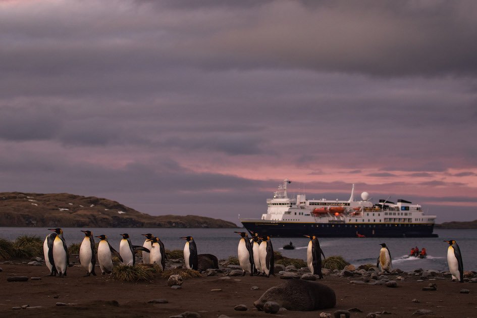 On National Geographic Endeavour II today, we explored Bartolome, home of a small colony of Galapagos penguins. Bartolome is one of the youngest islands, and it is located next to Santiago Island in the central part of the archipelago. After an amazing sunrise, we went ashore for a walk, and we were transported back to a time when the land was newly formed. We began our day by hiking to the top of a tuff cone known as the islet of Bartolome, named after the First Officer of The Beagle . Walking on this young island allowed us to understand the formation and volcanism of the Galapagos Islands. The rocks are a great way to understand the area and its geology. We spotted a few lava lizards and painted locusts, some of the very few animals on this island. As we reached the top, we had a great view. Our guests enjoyed the magnificence of Pinnacle Rock. After we visited one of the most iconic geological formations of the Galapagos, our breakfast was enhanced by dramatic views of the impressive volcanic landscape. We visited the beach near Pinnacle Rock, where we enjoyed how the sun made the sand sparkle due to a concentration of silica. Later, we went snorkeling along the channel between Santiago and Bartolome Islands. Many of our guests spotted whitetip reef sharks and very colorful parrotfish. The landscape was beautiful with lots of sea stars. We enjoyed the chance to be surrounded by Galapagos penguins and feel accepted as part of this environment. After a delicious Mexican lunch, we had lectures on the photography of reptiles and Darwin. Afterwards, we went to Chinese Hat Islet to snorkel from the Zodiacs. The area is home to a small colony of Galapagos penguins. In a sandy-bottomed, sheltered channel, our guests enjoyed swimming with whitetip reef sharks, rays, and many fish. It was a nice and sunny afternoon. After snorkeling, we had the chance to explore the unique, small volcano that formed an island in front of Santiago on a sunset Zodiac ride. After a spectacular day full of activities in the field, we returned on board. Every day in the Galapagos is an opportunity to reconnect with the beauty of nature through unbelievable encounters!
