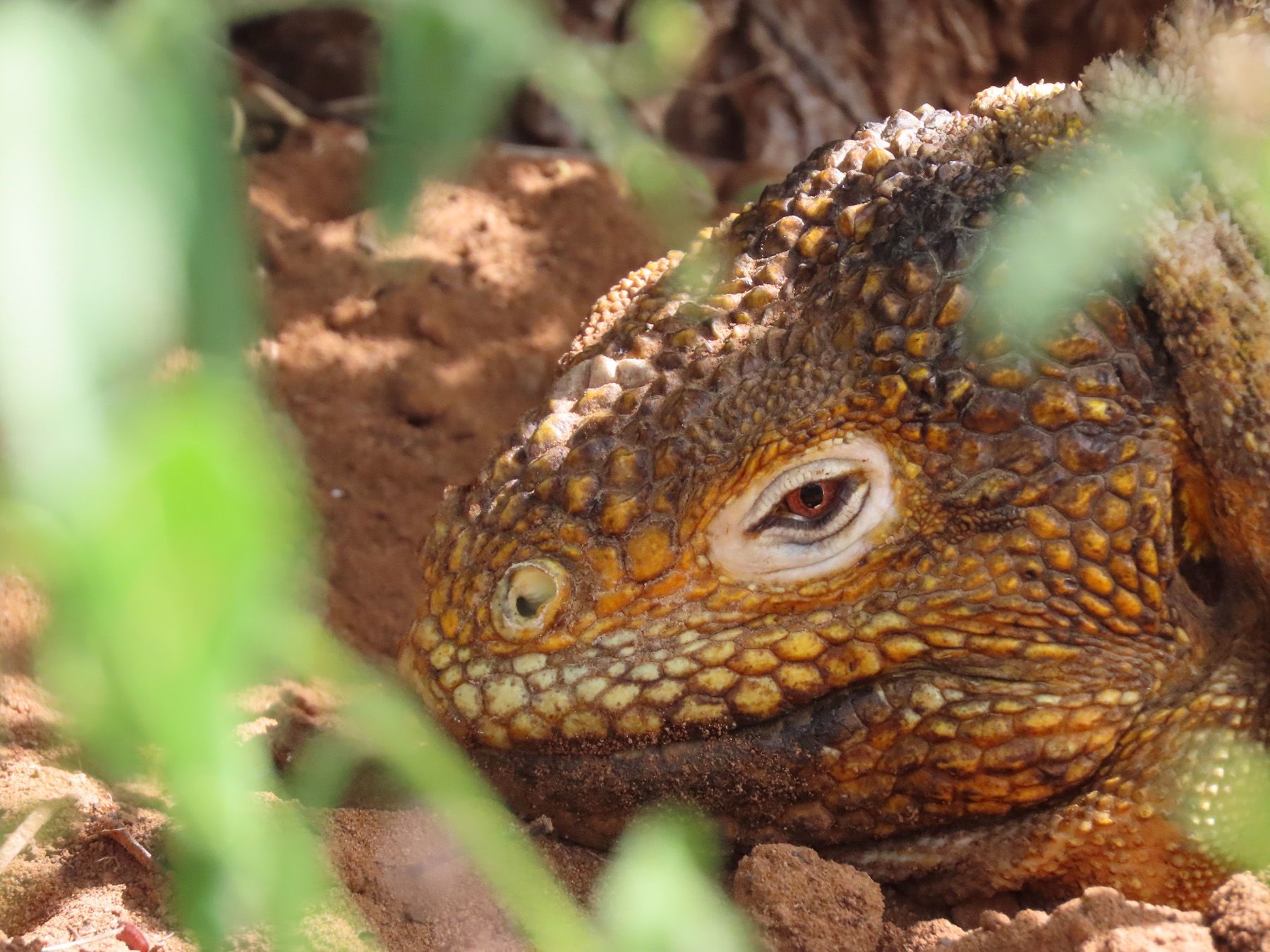 Along the trail, we saw beautiful yellow cotton flowers endemic to Galapagos, a few small and medium beak inches, Galapagos mockingbirds were also along the trail looking for insects. The trail was clean, nonetheless, the entire area was covered with ground plants that made a little bit difficult to find the land iguanas. We did find a few iguanas here and there, some more colorful than others and some more skittish, which made it harder to take pictures of them.