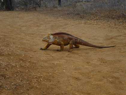 Today we started our day at the northwest end of Santa Cruz Island, at a visitor site of the national park known as Cerro Dragon, named after the Galapagos land iguanas.  Before breakfast, we disembarked on a rocky coast that took us to a trail by the coast.  The morning was spectacular for our hike, with blue skies and a blazing sun.  On the coast we spotted several marine iguanas basking on the green carpet mat plant, creating perfect photo opportunities.  Further along, we walked by a brackish lagoon that took us into the land iguanas territory.  With the help of our young explorers, we spotted many land iguanas.  After learning about the ecology and biology of these endemic reptiles, we continued our climb up the hill.  From the top we had an amazing view of Santiago Island and a group of small satellites islets known as Guy Fawkes, named after a British rebel who attempted to blow up the House of Lords in the 1600s.