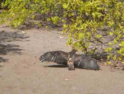 Early in the morning our guests disembarked on Espumilla Beach. The weather conditions were excellent with calm seas, soft winds and the first beams of sun illuminating the green beach, which was marked with a great number of sea turtle tracks from the previous night. Inland, the landscape changed completely. Observing giant “palo santo” trees, land birds and Galapagos hawks were flying in circles over our heads. We observed one of them landing close to us, approaching and opening its wings as if it was intentionally posing for a picture.