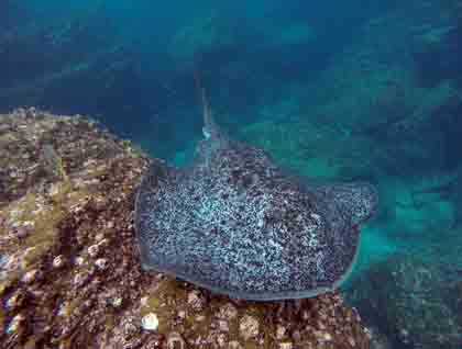 After many hours sailing from Isabela, our arrival to Santiago early this morning was upon calm seas and under cloudy skies.  We started early with exploration kayaking along the gigantic cliffs near Espumilla beach and its surroundings. We observed blue footed boobies on the rocks, some of them in feeding frenzy, taking advantage of the clear waters which offered great visibility. Paddling north we observed huge collapsed rocks, dropped from the cliffs a few years ago and now home to a small colony of fur sea lions, which swam playfully or rested disinterestedly on the flat rocks. While we kayaked, another group of guests landed on Espumilla beach, one of the largest green sea turtle nesting areas in Galapagos and home of large Palo Santo incense trees, which were green due to the last rainfalls. There were many fresh sea turtle tracks left by those incredible reptiles last night.  The National Geographic Islander was repositioned and we arrived shortly at Buccaneers Cove, a popular site for ships during the 18th & 19th centuries. Here our guests enjoyed snorkeling in the clear and warm waters, observing various white tipped reef sharks, sting rays, eagle rays and Indio-pacific bonito tunas zipping into the shallows to feed upon the small anchovies. On the rocks, fur and Galapagos sea lions observed us attentively while in the air, blue footed boobies and pelicans looked for fish.   Weighing anchor one last time this morning, we continued towards Puerto Egas a bit farther south on Santiago Island.