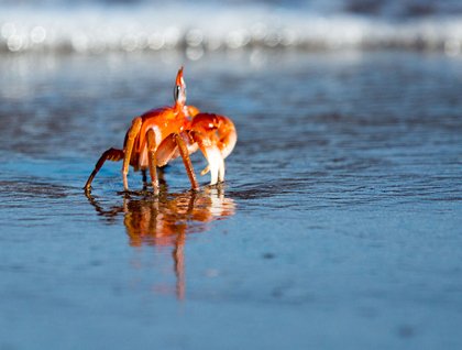 The morning outing took place at Espumilla beach. The low tide allowed us the opportunity to take a pleasant walk along this golden sandy beach. Ghost craps were very busy vacuuming up the microscopic organic detritus from the beach. While some of us spent time on the beach improving our photography skills, others opted to go for a more invigorating walk to the interior of the island. Both places were rich with wildlife unique to the Galapagos, and our eager explorers sighted finches, warblers and mockingbirds.