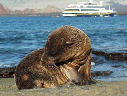 The afternoon told me that folks had not yet had enough of the ocean….quite a few took the early option to go ashore at Porto Egas and tried out swimming and snorkeling once more, this time off a dark sandy beach. Sea lions turned out to be the stars of the show – some in the water, but in particular three winsome pups that couldn’t leave each other alone. Not much over a month of age, their mothers were obviously out foraging and these youngsters had time to play. Very roly-poly, they were well fed and healthy-looking. Along the shoreline of James Bay, the afternoon light was golden. A new-born pup, possibly only hours old, was seen on the outer coastline. Shorebirds, oystercatchers, turnstones and plovers reflected in the mirror-calm tidal pools. Galapagos fur seals were seen at the far end of the trail where a small colony lived with easy access to deep fissures and pools.