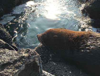 A repositioning of the ship brings us to Puerto Egas in the afternoon. A black beach and a poison apple tree welcomes us to, what appears to be a desolate island, however it holds various surprises for us. Walking along the outer coast as the sun starts to dip below the horizon, we find red Galapagos chaff and Mollugo bushes giving us a sea of red along our chosen path. Compacted ash sandwiched among basalt lava flows meet the sea as we search for wildlife and find innumerable species as they continue their duties … Sea lions dry in the afternoon sun as Sally Lightfoot crabs clean the exposed rocks of its algae. A large great blue heron hunts among the beach morning glory and a juvenile striated heron continuously bothers its parent for a meal.