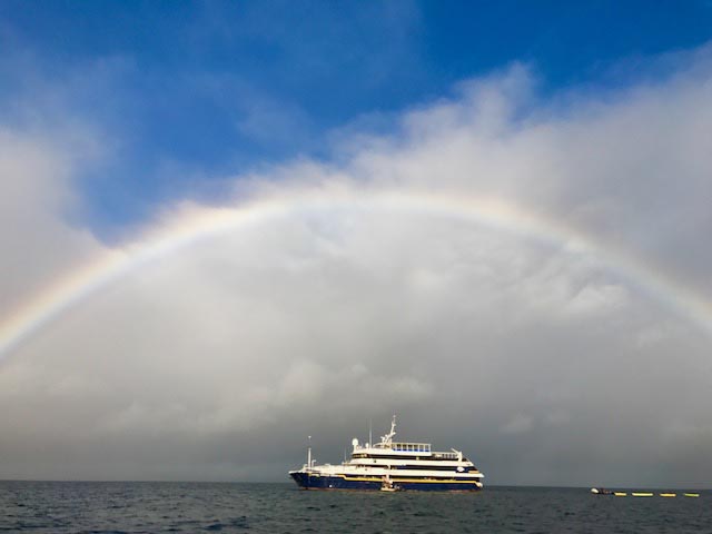 We woke up early in the morning as National Geographic Islander navigated along the northern part of Isabela Island. Slowly the sun appeared above the clouds surrounding Volcano Wolf. We spotted our first birds as Galapagos fur seals returned to shore from their night hunt. We enjoyed a great breakfast. Afterward, expedition leader Vanessa called everyone to the bow to celebrate as we crossed the equator. Our guests happily crossed the line. Approaching Punta Vicente Roca, the visitor site, we spotted Galapagos sea lions and a good number of ocean sunfish. The first activity of the day took place as we dropped anchor at Punta Vicente Roca. This is a spectacular geological site. The combination of the former volcano’s tall cliffs and the tuff cones formed later adds an amazing contrast to this unique visitor site. Our best tools for exploration, our Zodiacs, were lowered down, and off we went to explore the coast. We observed Nazca boobies and blue-footed boobies resting on the small ledges of the tuff cones. Galapagos sea lions swam close to our Zodiac, and Galapagos penguins rested on a broken piece of the tuff cone after feeding. What a wonderful sight! In a calm area, we found a good number of Pacific green sea turtles. The morning’s activities ended with snorkeling. Pacific green sea turtles, plenty of colorful fish, Galapagos marine iguanas and flightless cormorants surrounded us. It was a phenomenal experience! The ship was repositioned toward Fernandina Island. The youngest island of the archipelago, Fernandina is a highlight of our expedition. This island shows our guests the beginning of life. We observed animals thriving in the hostile environment. Pioneer plants like lava cacti grow on the lava fields, breaking down rocks little by little to create soil for the next generation of plants. Punta Espinoza is known for its huge colony of Galapagos marine iguanas. It is hard to distinguish the iguanas from rocks since they are so dark in color. On the other hand, colorful Sally Lightfoot crabs added contrast to the young, dark lava fields. We ended our walk as the sun was setting, returning to the ship with great memories. It was a fantastic day in the western part of the archipelago.