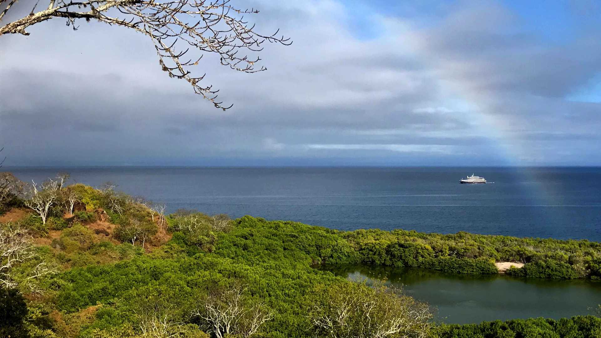 Yesterday we motored for few hours from the western part of the archipelago back again to the center Islands. We started our day on the western side of Santiago Island and after an early wake up call, we landed at Espumilla beach.  It is a place covered with an interesting mix of volcanic ashes and tiny pieces of olivine crystals where we spotted tracks made by sea turtles and holes made by ghost crabs.  After crossing a button Mangrove forest we walked through a dense vegetation tunnel made by branches and bark of Mangroves.  Then we continued through an area covered by huge Palo Santos trees, the soil was a bit wet, giving a very enjoyable smell. Now is the cold, dry season in Galapagos, but still raining in some parts of the archipelago. The walk was fabulous and at the end, up in the sky, a single Galapagos hawk was marauding, and mocking birds were protecting their territory. Then on our way back to the beach we saw a beautiful rainbow on the clear horizon. It was a great finale for a unique morning walk.