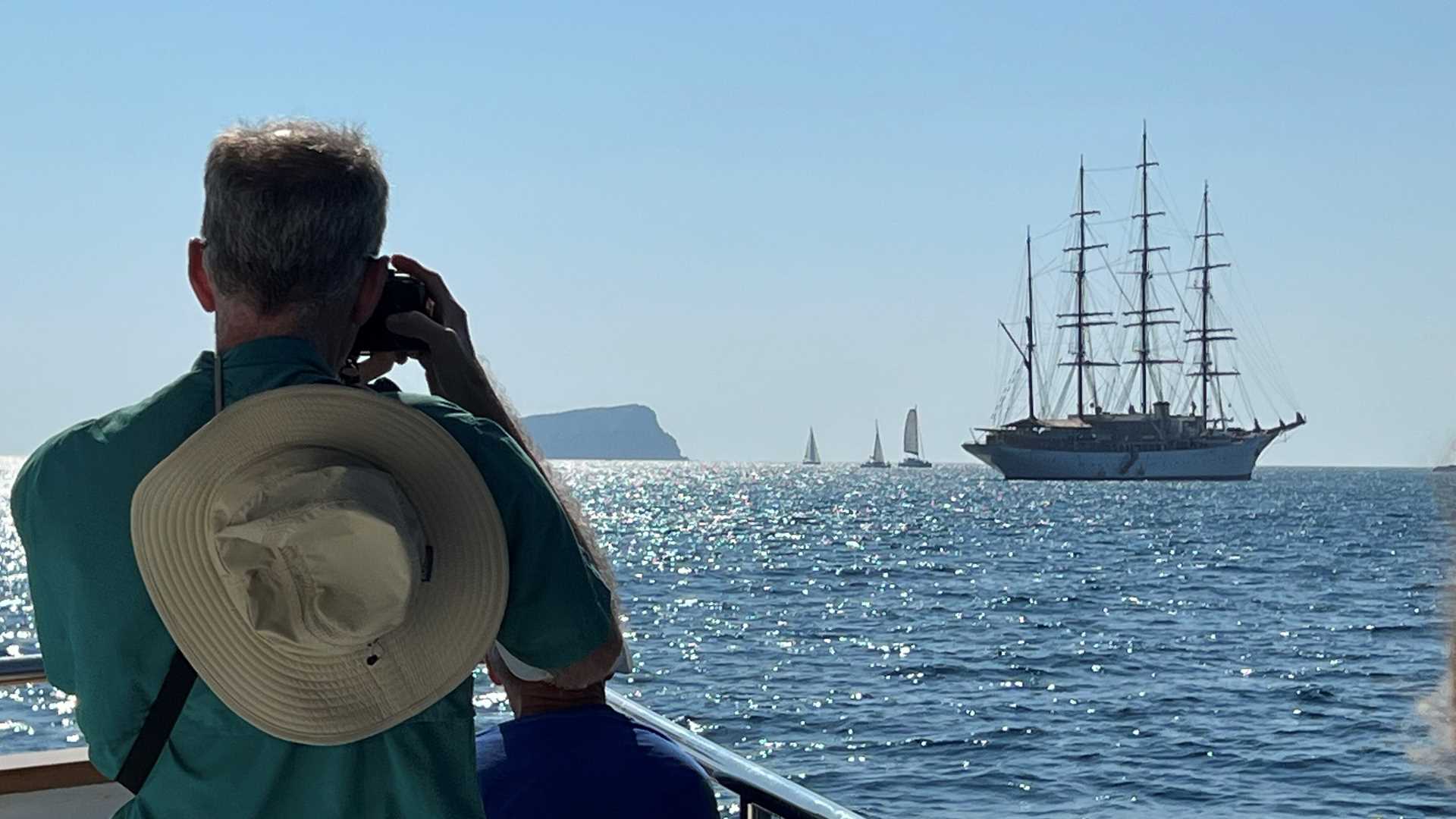 Santorini–a natural and historical wonder–is a must-stop for any group exploring the Greek Islands. Here, Sea Cloud anchored in a flooded caldera, and guests tendered to shore to tour the remarkable hillside villages and archaeological sites of the volcanic island.