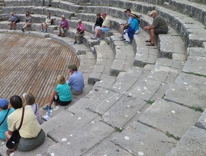 This morning we docked in Sarande, the well-known Albanian beach resort that has been expanding very fast in the last years. There are still a lot of unfinished buildings and hotels along the road towards Butrint. This archaeological site represents the rise and fall of the great empires that dominated the region. It has remnants of Hellenistic temple buildings, the Roman Empire’s aqueduct and baths, Byzantine mosaics, Venetian and Ottoman fortifications. What makes it even more special is that nature still holds claim to the grounds, and many ruins are still overgrown.