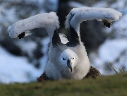 Saunder’s Island is home to a black-browed albatross nesting colony, which is reached by a lovely walk through fields of tussock and grassland. As we strolled leisurely towards the colony, Magellanic penguins poked in and out of their boroughs while keeping a somewhat wary watch on our progress. We found the albatross nests spread out across a long bluff, high above kelp forests and waves that pounded the rocky shore below. Individual downy chicks, nearly the size of their parents, sat on nest-bowls of soil, grass, and roots evenly spaced on the terraced cliffs. Occasionally, a single parent would return with a crop full of food, but otherwise the months-old chicks sat alone. It will be several more months before they are ready to spread their massive wings and ride the ocean winds north to feed on their own.