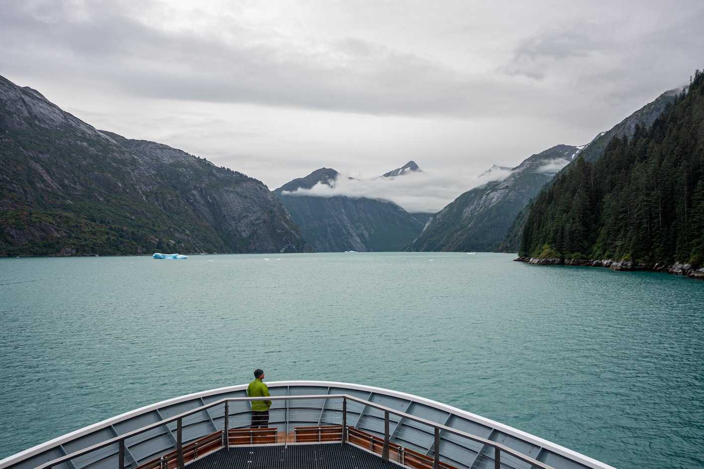 Some days are just too hard to put into words. It’s tough to imagine how such an action-packed week eploring Alaska’s coastal wilderness could possibly be wrapped up. After cruising north overnight from Petersburg, National Geographic Quest awoke to a wonderfully misty morning as we made our way up into the fjords of Tracy Arm-Fords Terror Wilderness Area. Passing by an increasing abundance of broken glacial ice, our eager anticipation grew with every corner we turned through the towering walls. Bundling up after breakfast, we headed out to explore Sawyer Glacier by Zodiac. Impressive waterfalls carved their way down to the turquoise waters as pigeon guillemots and Arctic terns flew by. Colorful flowers dotted the sides of the steep cliffs among the varying levels of vegetation growth, indicating the story of glacial movement and succession over many years past. Rounding the corners of the fjord, jaws dropped as we laid eyes on the deep blues of the exposed tidewater glacier face, towering 200 feet above the surface. As we enjoyed our hot cocoa delivered by the Lindblad-famous cocoa Vikings (deck and hotel crew), Sawyer treated us to various displays of impressive calving activity and the cracking sounds of “white thunder”.