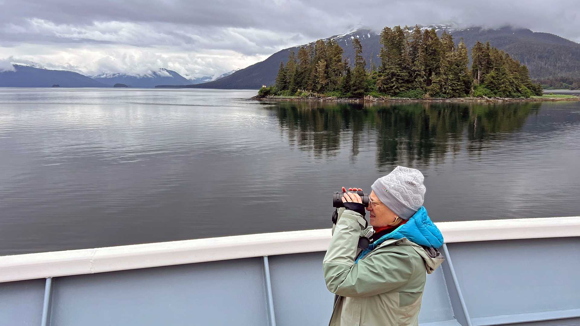 Our first full day in Southeast Alaska began with quite a magical start! As we cruised through the forested Sergius Narrows, we spotted a humpback whale bubble-net feeding in Peril Strait. Humpback whales spend all summer long feeding in Alaska, and we all spent the morning oohing and aahing as we enjoyed watching the whale use this unique feeding technique to catch herring. In the afternoon, we rode Zodiacs ashore to explore beautiful Ushk Bay. We wandered through a meadow sprinkled with wildflowers, crossed creeks in our muck boots, and began exploring the temperate rainforest. The typical Southeast Alaska rain showers rolled in as we ended our hikes, and we were happy to head back to National Geographic Venture for an evening of cocktails, dinner, and a presentation on the temperate rainforest we had just explored.