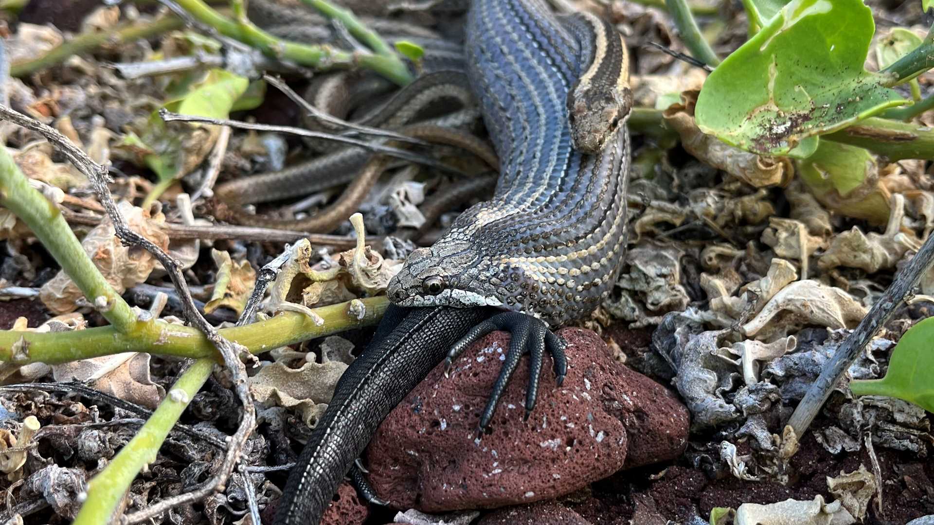 PHOTO: Santiago racer snake or God-of-Fire racer eating a marine iguana in Rabida Island. Photo by Walter Perez