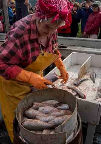 This morning we started off the day with a colorful presentation by the curator of the Herring Era Museum. We were told about the museum we were about to visit depicting a long ago time when the town of Siglufjorur was a bustling hub of the herring industry. Her talk whet our appetites for the experience of the museum, and we were eager to see the exhibits ourselves. Upon arrival we were treated to a living exhibit from the Herring Girls. These lovely ladies actually worked in the herring industry in their younger years. We watched as the ladies enacted a scene from days gone by as they cut fish and packed them into barrels of salt to be ready for market. It was as much entertaining as it was educational. They were accompanied by a few gentlemen who also took part in the exhibition, bring in the barrels of fish and hauling away the finished products. After the works done, they all broke out in traditional song and dance and as one might expect, it was not long before they had enticed a few of us intrepid travelers into dancing with them. A tasting of some pickled herring and a snort of schnapps and then we separated into groups to visit the rest of the museums offerings. In the wonderful diorama of an old fish pier we saw the vessels and equipment used by the fishermen as the set out to catch the herring that was the lifeblood of this community. Ships stores, dimly lit by lantern light gave a real idea of what life as a fisherman was like not that long ago. All told the museum consist of three buildings each centering on a different aspect of life in the heyday of the herring fisheries. As we walked back to the ship, we looked at the fishing vessels floating in the water in the harbor where we were berthed. After learning about the life of the people who fish for their livelihood, we viewed the small vessels through enlightened eyes.