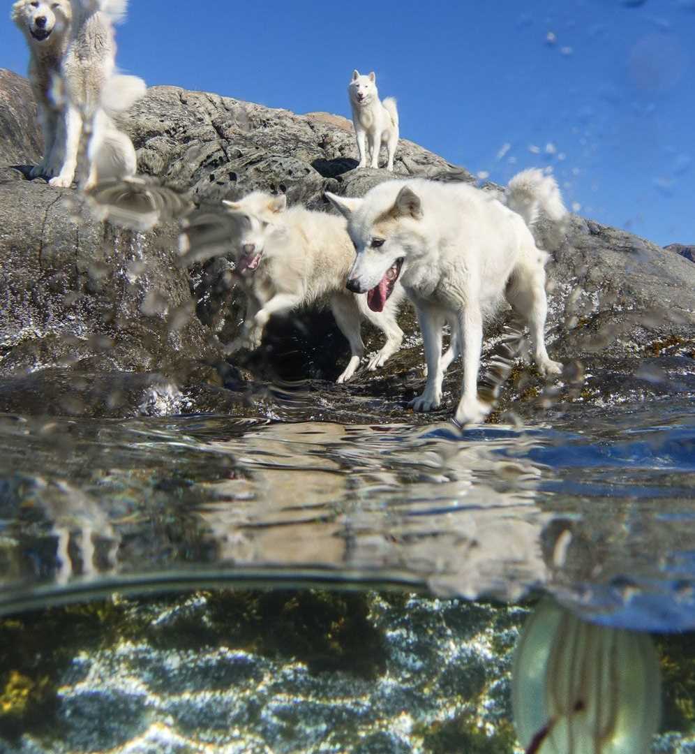 Whilst almost everyone explored the terrestrial terrain, the undersea team geared up to go diving in Sisimiut. But not in a swimsuit! Rather, suited up in dry suits, the divers descended below a tiny island that happened to be the summer home for a few sled team dogs, who were very confused by the divers. Below the surface the seafloor was bustling with life – a massive school of Atlantic cod swimming, gooseberries afloat, skeleton shrimps and various invertebrates clinging onto the abundant kelp, swaying in the current.