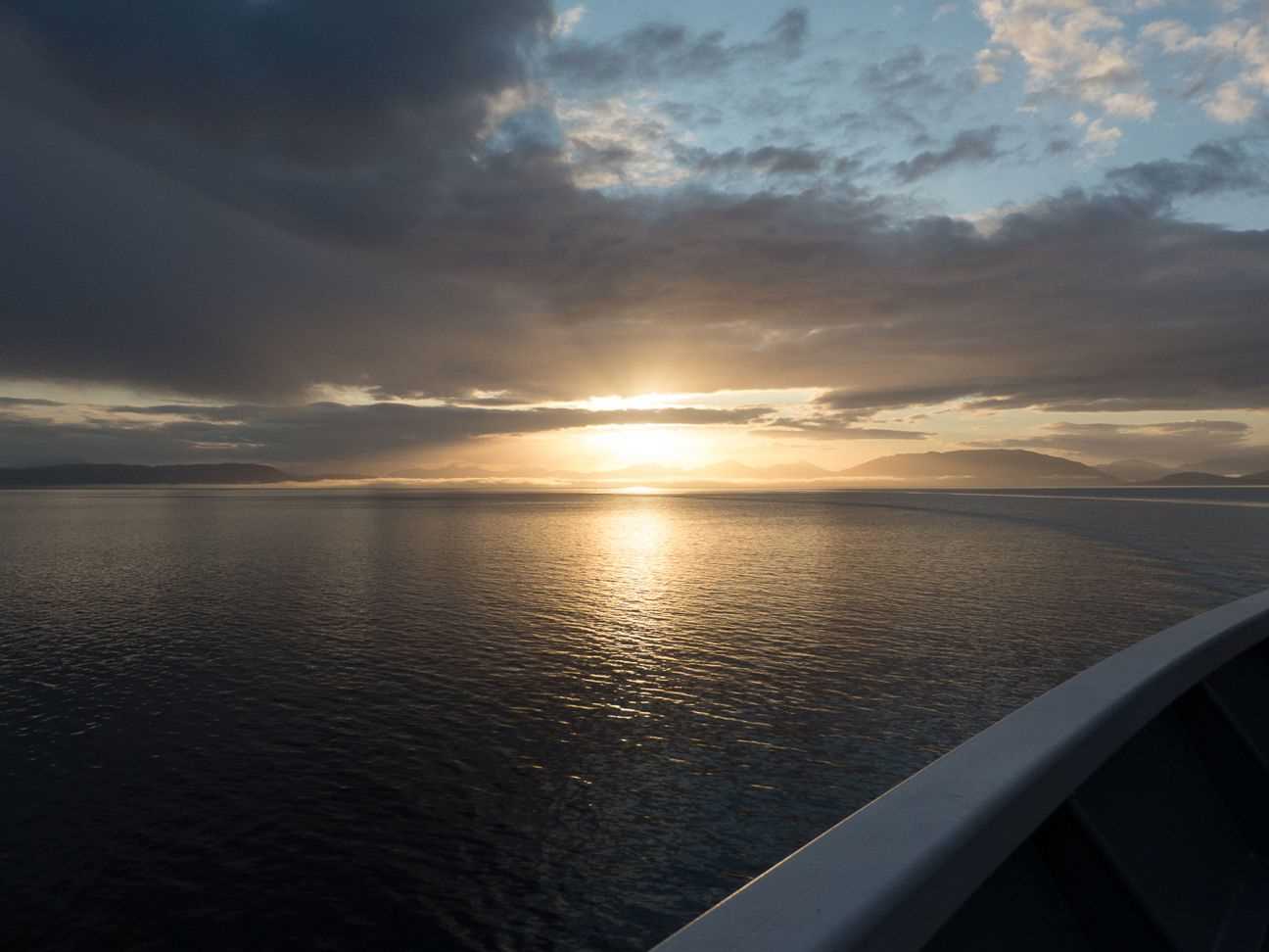 It is early morning on National Geographic Quest, and the rising sun is sending beams of light across the sky. We are sailing for Sitkoh Bay on Chichagof Island for a morning of adventure. By now we are old hands at this. We don our gear and take our places in Zodiacs for the short ride to the beach, rolling out like pros. Some set off for hikes while others go kayaking. Today our walks take us along a broad trail, past towering hemlocks and spruces. Along the way there are places we can look out at the bay, catching sight of brightly colored kayaks. There are ripe thimbleberries and brilliant orange shelving mushrooms, and everywhere the dense moss carpeting and leaves in every shade of green. Bears have been using this trail too, leaving their scat with its clues about what they have been eating—berries, sedges, and even the broken-up shells of barnacles. We find mottled banana slugs easing along, taking their time, as banana slugs do, on trails of slime.  Long hikers cross the beach meadow estuary and see salmon in a stream completing their journeys and their lives. Crows, gulls, and eagles come to take advantage. One group sees a river otter, another a bear. The summer is turning to fall today, with leaves falling from alder trees, but it is still full of life.