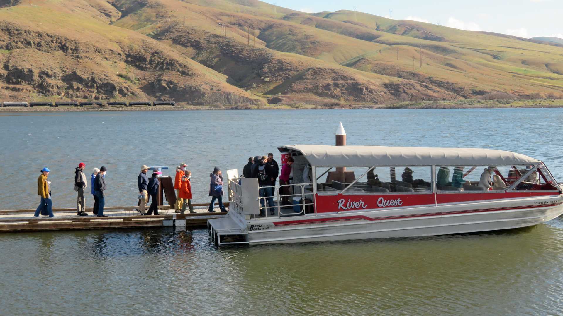 After passing the town of Asotin, leaving the pool of Lower Granite Lock and Dam, and entering the free-flowing Snake River, we slowed to view fan-shaped columnar basalt. We continued to scan this rugged area for its myriad of flora and fauna. Over the course of the day, we were rewarded with views of eagles, white pelicans, and bighorn sheep. We heard the story of a ranch whose owner still rows across Snake River to reach their car. A band of dogs waits on the bank for the owner’s return. Our forty-eight passenger, custom-made jet boat named Canyon Quest handled the rapids with ease. The boat’s powerful jet drives provided a comfortable and secure ride. We also heard about the 1905 wreck of a steamboat carrying valuable mining equipment, and we viewed Cougar Bar, a location connected to the Lewis and Clark Expedition.