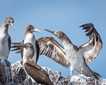 Today’s expedition took place on and around Santiago Island, we started off the day straight on the water with kayaking and paddle boarding in a beautiful crystal clear blue water channel between Sombrero Chino, a volcanic formation that resembles a giant Chinese hat and a field of lava flow from the 1897 called Sullivan Bay. It was sunny and warm and as we cruised along the coast of the lava flow, Galapagos penguins welcomed us into the channel. They were swimming, feeding and jumping out of the water to warm and dry up on the black lava rocks while posing for our pictures.