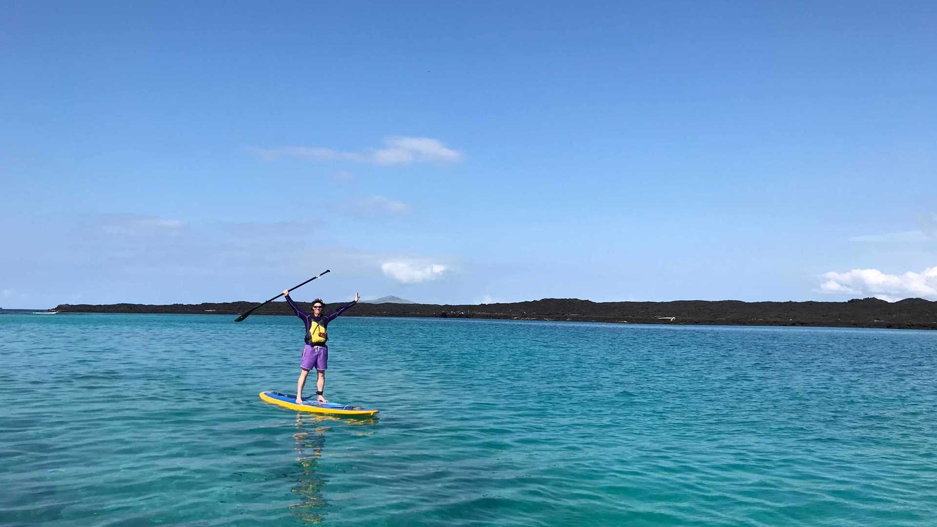 Today we woke up to the view of extensive lava flows surrounded by crystal clear waters and sandy bottoms. The morning expedition took place above and under water, in the breathtaking channel between Sombrero Chino Islet and Santiago Island. We kayaked, paddle boarded, went zodiac driving and lastly snorkeled with penguins, sharks, rays, sea lions and many fish. In the afternoon, we went looking for more penguins from the zodiacs and then hiking on one of the many lava flows of Santiago Island, the Sullivan Bay flow. This is the youngest lava flow on this island and dates back to the 1897, even though this flow is 120 years old there are only some pioneer plants such as lava cactus and mollugos. It will take many more years for the soil to be ready and other plants to establish and for wildlife to follow. The beauty of this flow reminds us how amazing nature is, being able to go from bare lava rock to beautiful green incense tree forests, just like it happens in the Galapagos Islands. We went back onboard having spent another stunning day in paradise with a spectacular sunset lighting our way back to the ship!