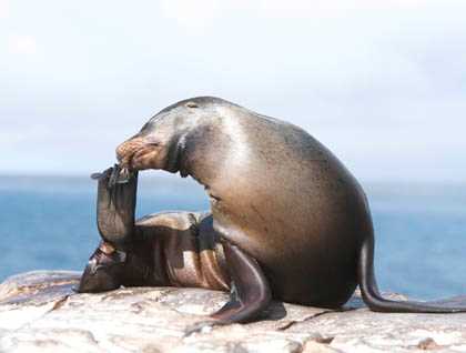 Following lunch, we moved south to Santa Fe Island for kayaking and snorkeling. The cliffs of this island are pristine with dramatic basalt strata and lava dykes adorned with the scattered vivid green foliage of Scalesia helleri, one of the many woody species of an endemic genus related to daisies and asters. Striated herons and yellow-crowned night herons patrolled the low rocks trying to snatch young Sally Lightfoot crabs, and the kayakers were able to view a low-perched Galápagos hawk at close range.