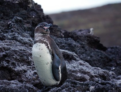 We walked on a flat trail that leads to a spectacular cliffside where many sea birds species were seen flying, resting and/or feeding their chicks.  Galapagos shearwaters were seen swiftly skimming the ocean surface looking for food.  Swallow tailed gulls were seen either flying around or taking care of their hungry offspring. Occasional frigate birds were seen gliding in the blue sky as well, in search of some small birds as prey. We could also see these pirates cleptoparasiting on boobies. Some Darwin finches, like the common cactus finches, were also seen.