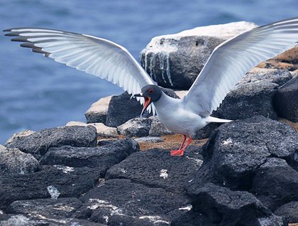 Further inland there is a spectacular cliff side where many sea bird species can be observed either flying around or resting. Once we arrived to the highest point to walk along the cliff, we found the best site to watch sea birds in action. Galapagos shearwaters were skimming the ocean surface looking for food while Nazca boobies were gliding along the cliffs. Beautiful Swallow tailed gulls were seen either flying around or taking care of their hungry white youngsters