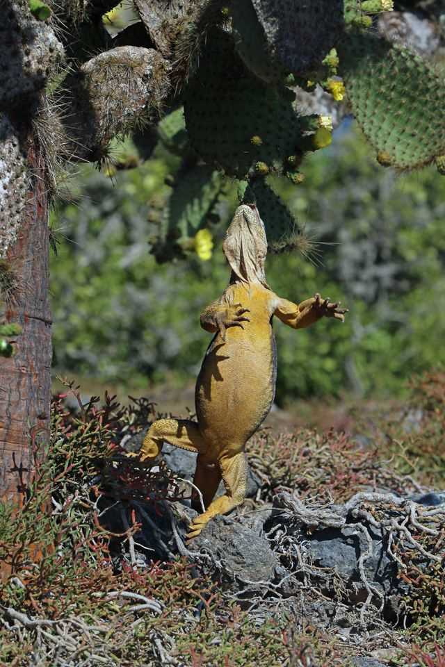 After a beautiful sunny morning hike, we returned to the ship for a refreshing well-deserved dip in the sea, and many even jumped off the ship. This is the beginning of the warm season and the temperature of the water was just perfect! Midday we navigated southbound toward Santa Fe, considered one of the oldest in the archipelago. Its outline is rather flat; therefore, its vegetation belongs to the arid or dry zone typically represented by the opuntia cacti. Here, the Santa Fe endemic species distinguishes itself from other prickly pear species of the archipelago by reaching a girth of up to four feet wide for some very old individuals. Santa Fe has its own species of land iguana, the conolopus pallidus. They are found scattered on the very rocky terrain of the island, where they usually live happily ever in the vicinity of a cactus tree.