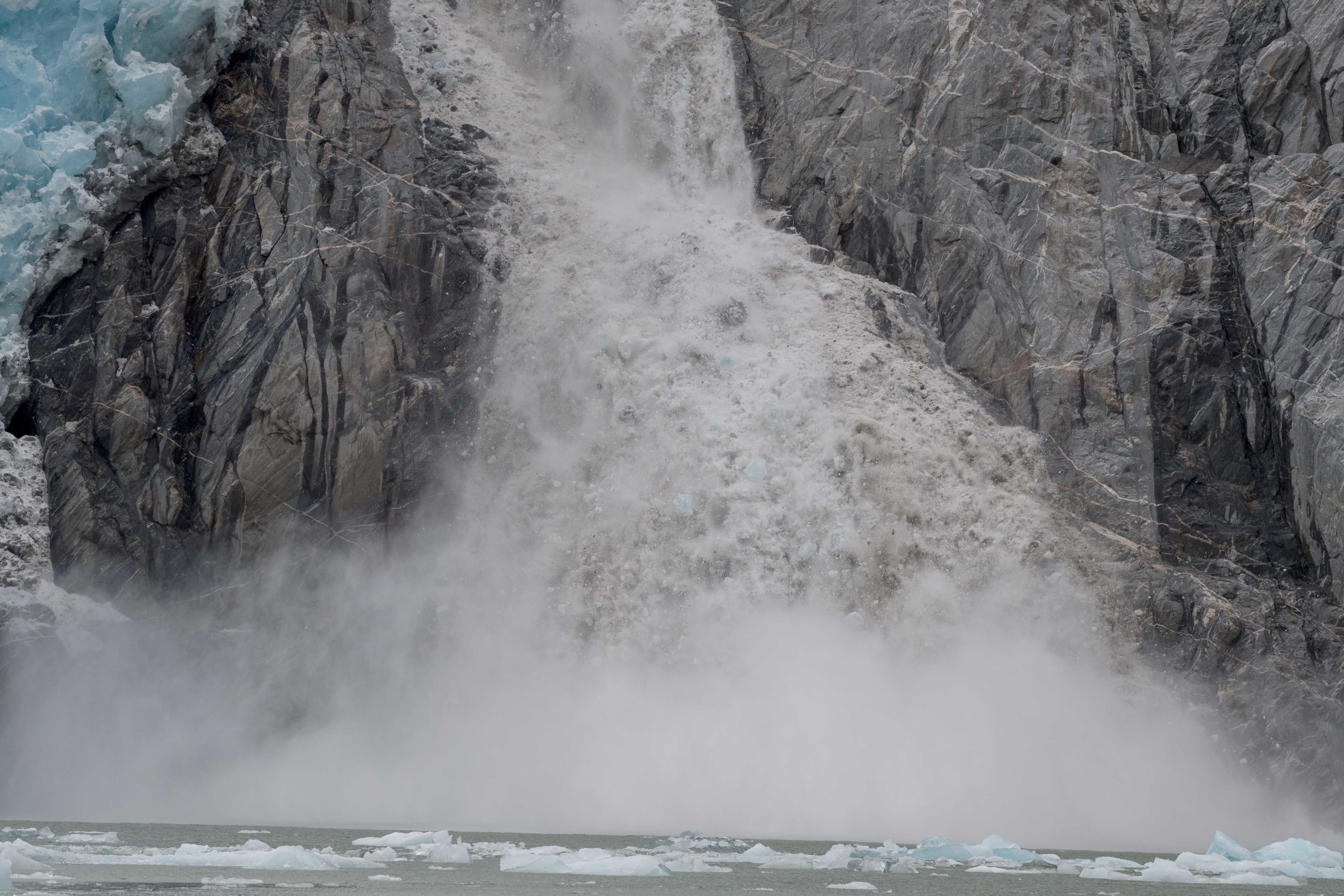 As we approached, it was as though the frozen giant seemed asleep. There was an occasional grumble, and maybe a crack or two as the ice-frozen river moved down to the sea. Ten, as if stirring from its nap, a few small caving events got our attention. First from one side, then the other, and then the middle of the glacier let loose of small avalanches of ice, causing every head to turn in the direction of the last icefall. Each of us on the boat gave our best guesses of where the next bigger calving would take place. Heavy money seemed to be on the right side of the glacier where the ice met the rock. There seemed to be a good deal of activity as falling ice was almost constant. The ice would often pick up small pieces of rock that join the ice on its way to the water below. The source of this activity was a large section of glacier that seemed to have a big crevice opening up at top of the section. You could feel the apprehension of a larger more dramatic calving every time some ice or rocks rolled down the hillside. Then, just as all hope was quickly diminishing, the huge section of ice let go. As it hit the surrounding rock it seemed to disintegrate and what was moments before a building size piece of ice, was now an avalanche of cascading ice and rock crashing into the sea. Its entrance into the water was no less than spectacular and the spray that was generated by the ice and rock entering the sea shot into the air like a burst of fireworks on the Fourth of July. Our hope had been fulfilled and we got to see, hear, and even feel the ice release a part of itself, making the cycle complete, and beginning again, the process of water turning into snow, snow turning into ice, and ice returning once again to the sea.