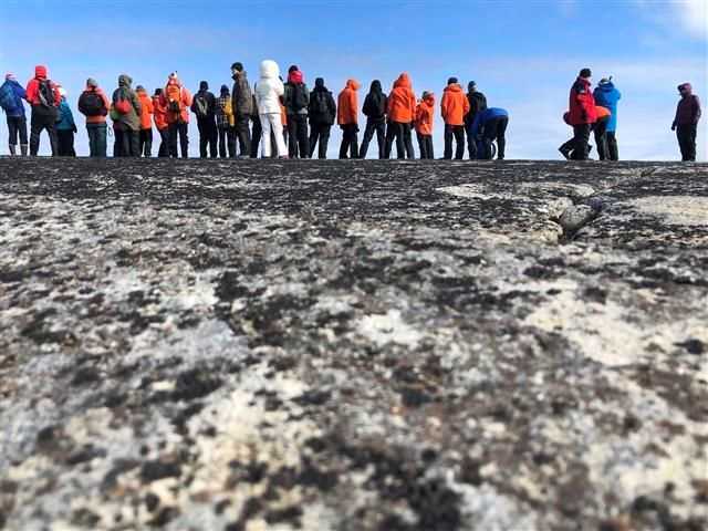 During lunch, the weather turned a little and the wind kicked up, but not enough to stop us as we headed out in Zodiacs to land on the rocks of Boltodden. Once landed, there was a surprise: a perfect set of dinosaur footprints? Set into the sandstone, the prints—about 30x30 centimeters—looked as through the animal had walked over the beach just hours ago.