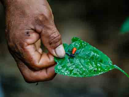 One we reached the caldera we could see the fumes from the boiling cauldron bubbling with molten rock, sulphric gases (hydrogen-sulfide), and a mud-water mixture. Our guide for the day was the wonderfully voluble Padilla. She is a life-long native of the area and knows all the island lore. Our first stop was the visitor center where we saw a five-minute video on the volcanology of the island and Soufriere in particular. We visited the crater’s edge and had a specialized guide explain the volcanology to us. The smell of sulfur was pungent, especially when the wind shifted. After leaving the caldera we drove to the Diamond Falls Botanical Garden, a gift to the island by the owners, the Du Boulay family. The Du Boulays received the land from King Louis the XIV in 1713 and the present owner is a lineal descendant. The garden is a cornucopia of tropical plants of every variety from the spectacular heliconias with their blinding vivid yellows and reds to the wonderfully stately nutmeg trees. Padilla pointed out the bamboo—the national plant of St. Lucia—which can grow eight inches a day and reach 50 feet tall and six inches in diameter. We spent an hour in the garden and after our visit we returned to our vans for the very short drive to the center of Soufriere.