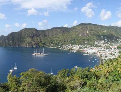 The sun rose this morning at 6:20. We had a mature wind speed of 20 mph and a long fetching sea swell of two meters. The morning air was crisp with a salt tang. After breakfast Tom Heffernan gave a talk on the languages of the Caribbean. We reached our destination of Soufriere in the southwest of St. Lucia by 12 p.m. After lunch we boarded our tenders for the short motor into the harbor of Soufriere. The physical setting is very dramatic as the town of Soufriere (population 12,000) is actually situated at the west end of an ancient caldera, where the volcano blew the western ridge of the mountain chain away about 39,000 years ago. It is picture-book perfect. The name of the town means “sulphur air,” which would be become very clearly evident when we drove inside the great ancient caldera.
