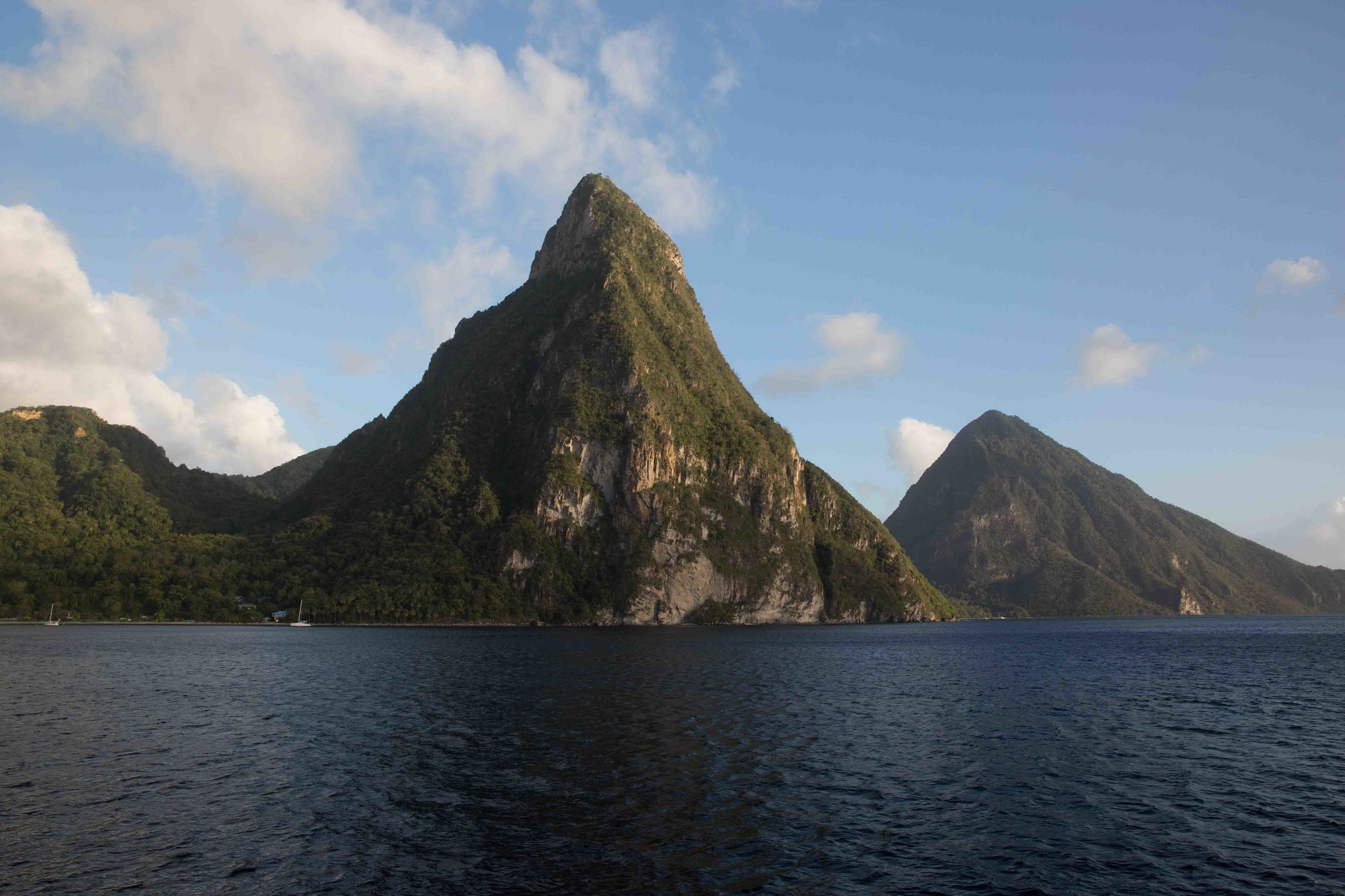 Our next port of call was St. Lucia. We dropped anchor in beautiful Soufrière Bay. The sea was extremely deep and we dropped more than 500 feet of the massive anchor chain, each link of which is the length and breadth of a human thigh. The physical setting was very dramatic as Soufrière is actually situated at the west end of an ancient caldera—a volcano blew the western ridge of the mountain chain away about 39 thousand years ago.