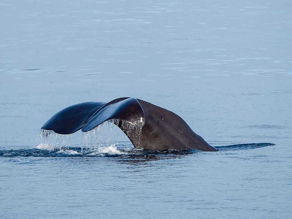 Our first unusual sighting was an adult bull sperm whale in less than 200 feet of water depth. Normally sperm whales are found in waters much deeper than this. Captain Kruess skillfully maneuvered the ship so that all could see this whale that none of the staff expected to encounter in waters this shallow.