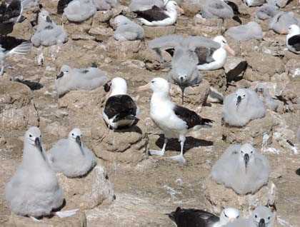 The island of Steeple Jason, part of Jason Archipelago named for the 17th century British exploratory ship JASON, is seldom visited by tourists, because its isolation and exposure put it in the path of strong winds and heavy seas that commonly buffet this western region of the Falkland Islands. Conditions, however, were quite good for us this morning. We arrived at low tide and knew the rising tide would improve the landing situation throughout the morning, so we attempted a rather difficult landing on exposed algal-covered rocks assuming it would improve as time progressed. Most everyone attempted it. The conditions demanded that everyone be careful, and as a result, there were no injuries. Once everyone was ashore, we hiked past lounging southern sea lions and continued a mile or so to view a low coastal region that contains the largest black-browed albatross nesting colony in the Falkland Islands…something on the order of 150,000 nesting pairs. This huge number is hard to imagine, especially since it has the potential of 450,000 birds when all parents and chicks are present at one time…which probably seldom occurs. For those who wanted close-up views of the albatrosses (as well as a few rockhopper penguins that had gathered along the edge of the rocks below the nesting albatrosses), we had to deal with a healthy, thick growth of tussock (tussac) grass. As people worked their way through this dense and thick vegetation that at times towered over our heads, people better appreciated the extent and importance of this native clumping grass that defines the Falkland Islands. Most of it has long since disappeared with the coming of humans and their domesticated grazing animals in the 19th century, i.e. cattle and sheep, but many of the wildlife regions (including Steeple Jason) still abound with the stuff today. Once we pushed our way down through the tussock, we were rewarded with amazing views of nesting albatrosses and their large, downy chicks. This seems to have been a very successful breeding season, because literally every nest held a single large albatross chick. Generally, the adults court and lay their eggs in late September or early October. After about 68 days, the egg hatches and then it takes another four months or so to fledge the chick. Our visit today was about a month and a half before fledging takes place in late March.