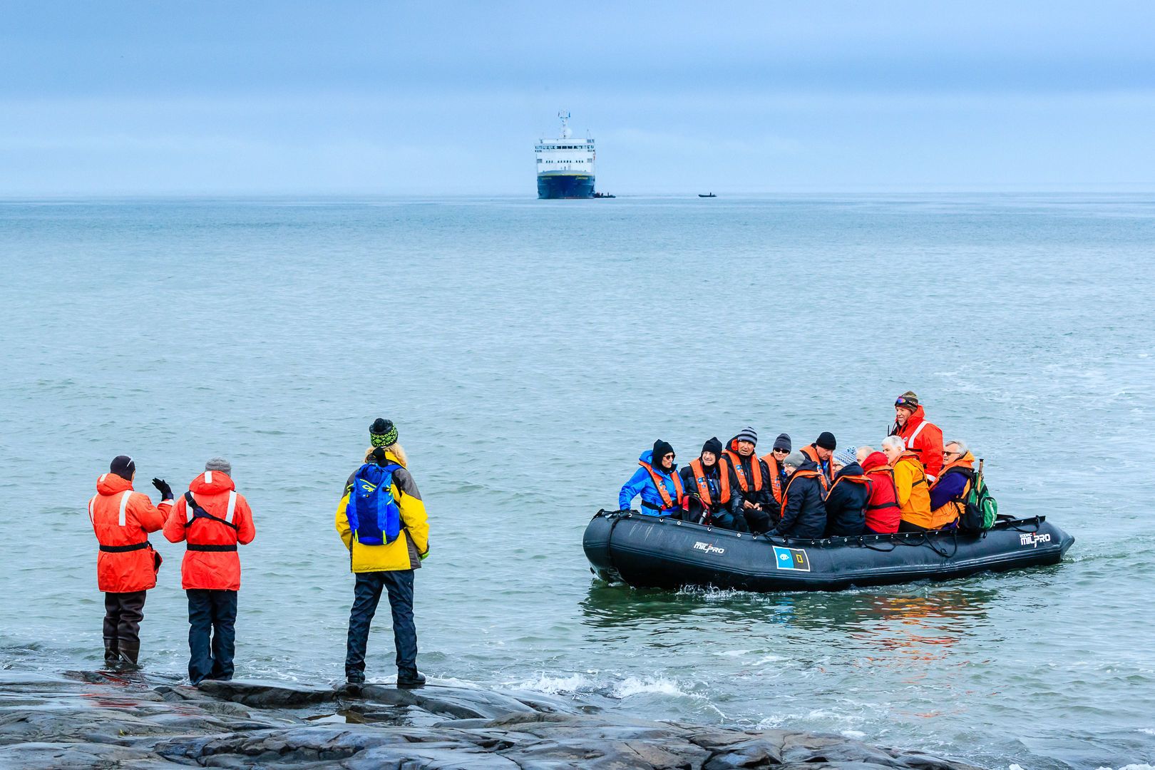 The expedition from Svalbard to Greenland and all the way to Iceland is underway! Our first full day on board was a great introduction to the High Arctic of Svalbard. We awoke to wind-driven swells as we rounded the south cape of Spitsbergen, the archipelago’s largest island, and sailed into Storfjorden. After lunch, we arrived at the third largest island of Edegøya. Here we went ashore to explore an area called Russebukta, or Russian Bay. Svalbard reindeer greeted us as we stepped from the Zodiacs onto the smooth, glacially-polished rock outcrops. The tundra was soft and spongy underfoot. Purple saxifrage wildflowers painted the landscape in between the green mosses and lichen. Birders among the group spotted a variety of birds in the tundra ponds, including purple sandpipers, gray phalaropes, and king eiders. Dressed for the weather, we returned to the ship as the wind freshened. After a well-deserved hot shower, we enjoyed the Captain’s Welcome cocktail reception and dinner. It was our kind of expedition!
