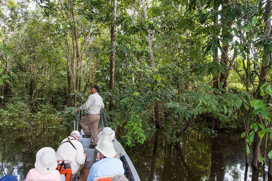 After exploring the Pacaya River and finding jaguars, capybaras, and river otters, we are again near the Marañon River, another major tributary of the Amazon that we are exploring at the end of our week. We came to Magdalena, a secondary water stream that feeds the Ucayali, to explore it early in the morning. This site is very famous for birdwatching. We observed the shoreline from our skiffs and spotted all kinds of river birds and land birds. We observed many types of herons, such as the cocoi heron and the multicolored black-capped heron. We also saw egrets and cormorants fishing. These waters are rich in nutrients coming from the Andes, which mix with the sediments of millions of plants to create an abundance of phytoplankton, food for aquatic creatures. Along the grassy areas, we found brilliant birds, including cardinals, wrens, woodpeckers, oropendolas, toucanets, and euphonias. We came back on board, and our cabin stewards did a presentation on origami towels. They do a great job creating animals of the jungle, such as sloths or monkeys, with the towels in each of our cabins. In the afternoon, we disembarked at a very small reserve to walk into the jungle. Squirrel monkeys came so close to us. At the end of the trail, we found a very small lagoon, where a unique type of plant grows: water lily pads, or Amazonian Victoria regias. Some of our guests kayaked along the Yarapa River, and others explored the area on skiffs. For the first time this week, we got rain! Thunder and lightning invaded the skies of the jungle, also known as the rainforest! Our intrepid guests went out to experience a storm in the Upper Amazon. It was a great experience, and even the sudden change in weather did not diminish the adventurous spirits of our fearless explorers.