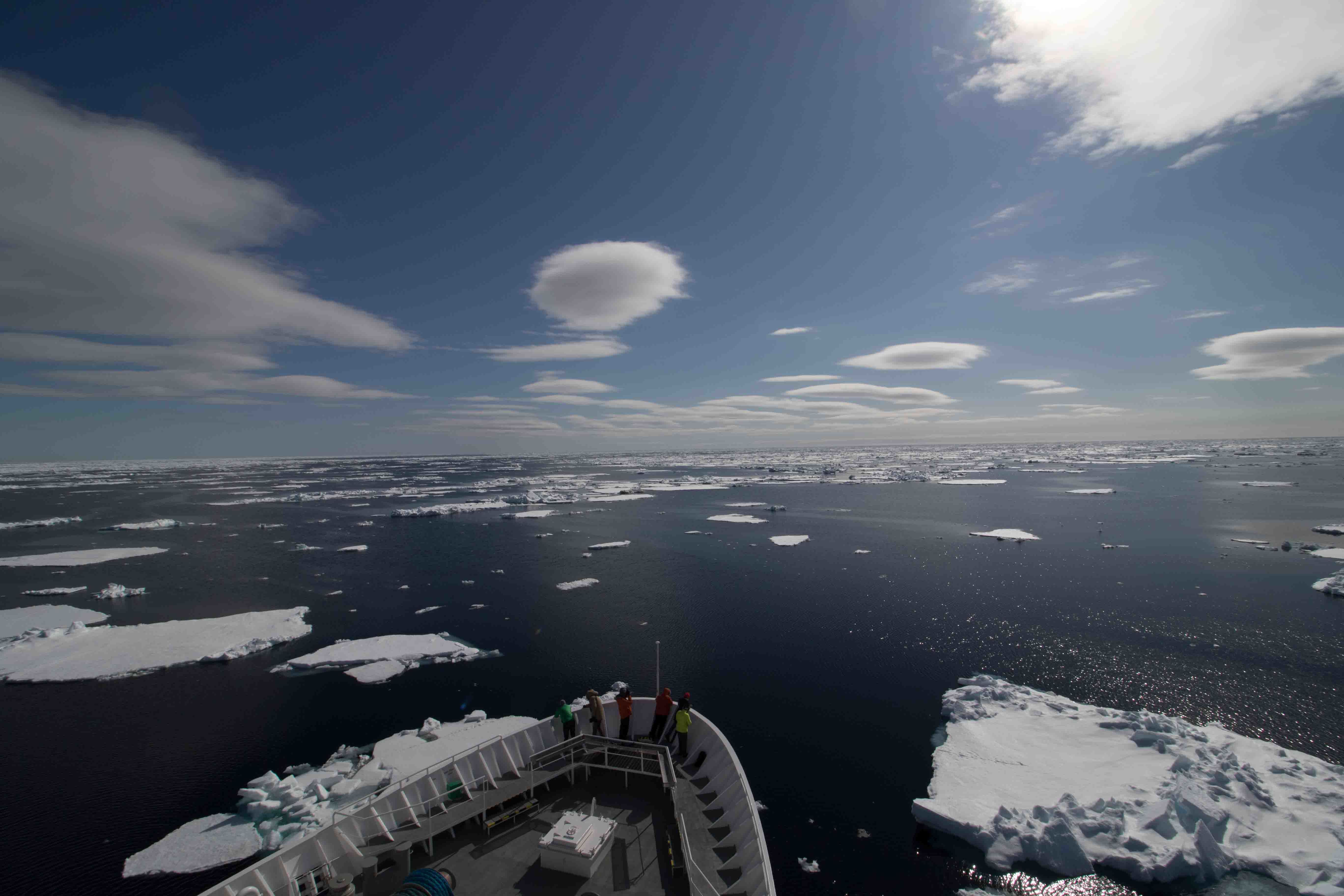 While we continued searching, we heard talks by our distinguished guest speakers and the ship’s naturalist staff. In the middle of the afternoon, we found a space where the ice floes gave way to open water where we got into Zodiacs for a close-up experience with pack ice and the various shapes and forms of ice. A few species of Arctic seabirds were around, and we even spotted some bearded seals.