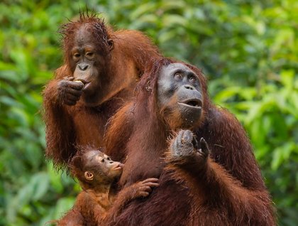 Seeing a wild orangutan swing through the forest canopy is like going back in time, deep into our collective memory. Orangutans share 97% of our DNA and just a simple gaze towards us sends chills up our spine. We watch in awe as a mother carrying her baby climbs up the feeding platform.