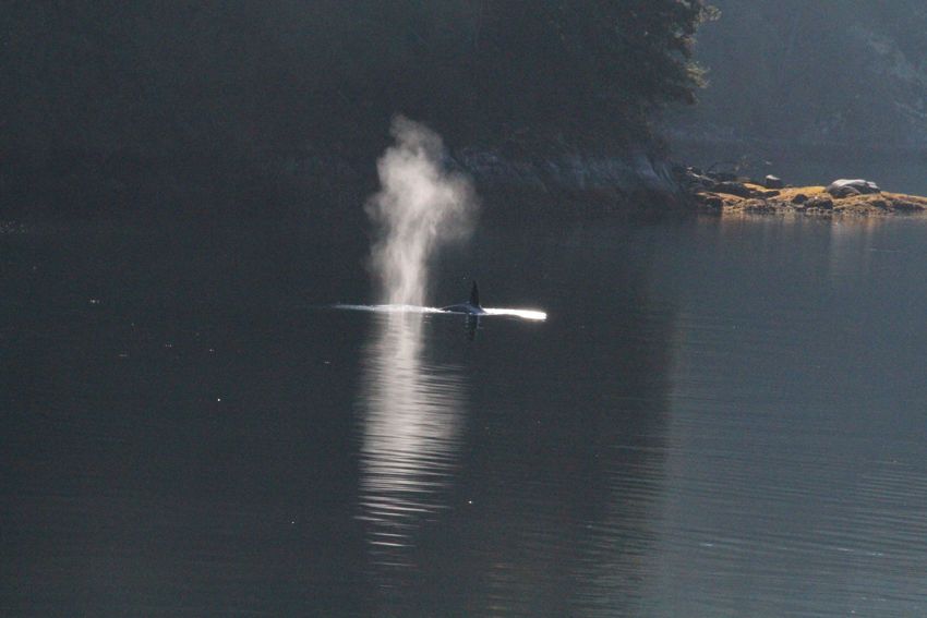 The fog was thick as we made our way into Desolation Sound Marine Provincial Park. We scanned the sound before breakfast, looking for the telltale vertical columns of haze that would signal the presence of our cetacean quarry in the pre-dawn chill, yet none were seen. After an early morning session of watching from the bow, it was time to come in for breakfast and a morning briefing. When we
