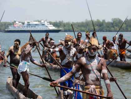 In theory, one could prepare for a day like today. You could listen to the briefings, take notes during the lectures or overhear stories from the likes of Lawrence Blair and Valerie Taylor of what it was like to visit several decades ago. Even the timing of when it will all start is painstakingly coordinated, as mid morning finds an ordered row of full Zodiacs headed upstream to the village of Agats here in the Asmat region of New Guinea. For a fleeting moment there is a sensation of confidence that occurs when moving in a formation, and then everything you learned, or thought you knew, is replaced by raw wonder. Upon rounding the last river bend we are transported back centuries. Awaiting our arrival are over a hundred wooden canoes, each with a crew of at least four or five fiercely festooned figures. In unison a ululating cry goes up, not some dull roar of a stadium audience, but a rhythmic vocal pulse that strikes a chord deep inside each one of us. The lilting howls rise and fall while as one the flotilla of canoes is moving closer. The men paddling are all standing, easily balancing without the slightest appearance of difficulty, and with swift precise strokes this intimidating welcome party already has us surrounded and herds us to the shore. As we near the landing, the sing-song chanting starts to break down along with the coherency of our escort. Zodiacs and canoes are now all jumbled together providing up close and personal looks at the unique body and face paint that each man has adorned himself with.
