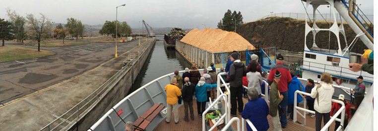 Under uncertain skies we started our day at The Dalles lock and dam. There has not been much traffic on the river these last few weeks, but this morning held a special treat as we locked through The Dalles with another vessel. The barge held an eclectic load; one barge was stacked with smashed automobiles headed for recycling and the second barge was piled high with wood chips destined to become cardboard.