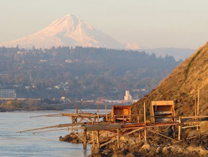 Today was another glorious fall day just like the last few—crisp, clear, and lovely. One of our first sights was of Mt. Hood to the southwest, covered in snow and glowing softly in the early morning light. On departing the ship, we were welcomed to The Dalles by local volunteers in period costume; they made us feel very warmly greeted. Our first stop was the spectacular Columbia River Gorge Discovery Center, with exhibits on the geology, natural history, and native cultures of the Gorge as well as a display of all the cargo carried by the Corps of Discovery and of other explorers and subsequent settlers.