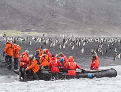This morning we were also destined to make a similar discovery and approach Antarctica at the South Shetland Islands. However thick fog limited visibility of the surroundings as we slowly passed through English Strait. Large icebergs and a rapid current made for some what tricky navigation by the skilled team of bridge officers, but we were soon through the channel and traveling along the eastern side of the South Shetland Islands. Many joyed at the first glimpses of penguins porpoising out of the water ahead of the ship. Briefings on Antarctica etiquette and Zodiac operations prepared us for our first landing of the voyage.